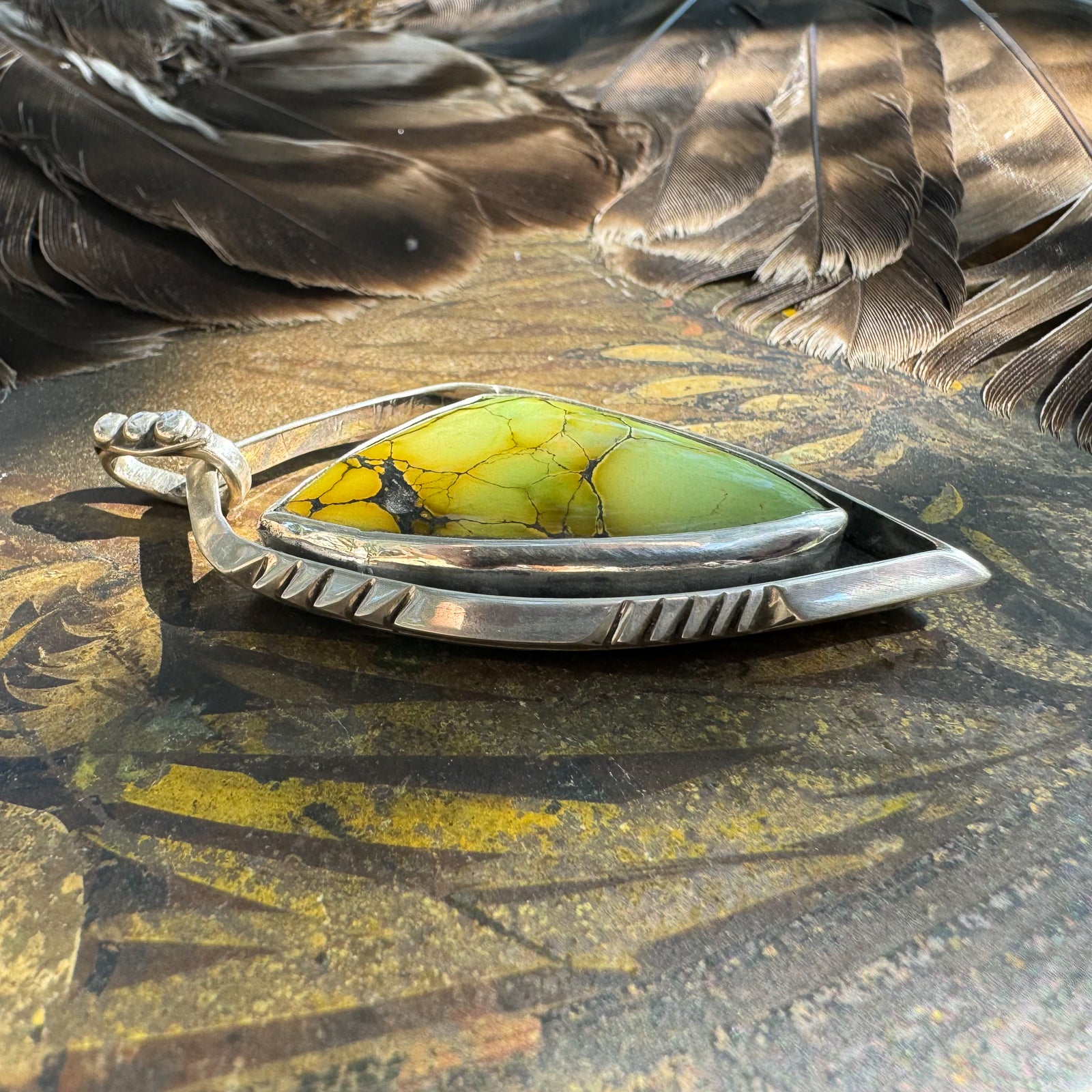 Gorgeous vibrant Hubei turquoise arrow set in a hand-sawed sterling silver geometric frame. This amazing piece of turquoise was cut by one of my favorite lapidary artists from Michigan. Art cuts turquoise in thick, geometric shapes which are perfect for a creating modern arrows. I played up the asymmetry of this stone by framing it in a feather cut frame and patina'd the low areas so that the stone appears to be floating. Arrows are power pieces, giving the wearer a feeling of strength and purpose. This arrow can be worn on a long chain so it sits on the chest near the heart or closer to the throat, so you can speak your truth. Suitable for all. (shown on a 16" omega chain and an 18" box chain). Pendant includes a box chain. Message me for more options and to choose the style and length for you.