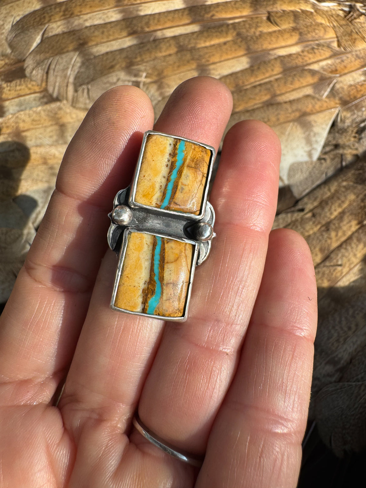 Vibrant rivers of Royston Turquoise run through a golden ground which remind me of weathered antler material in its coloring and rustic visual texture. Truly captivating and unusual.