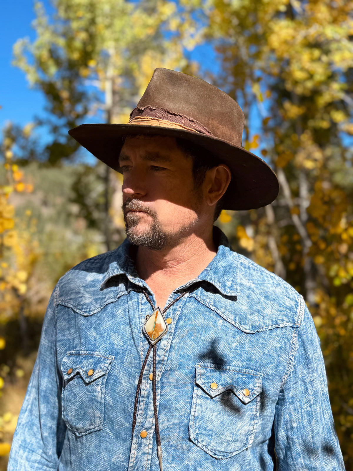 Full grain leather bolo cords are finished with distressed sterling silver tips.