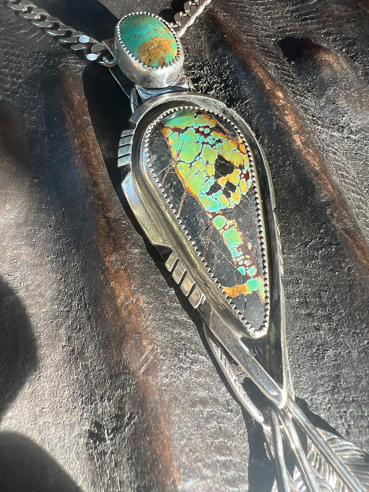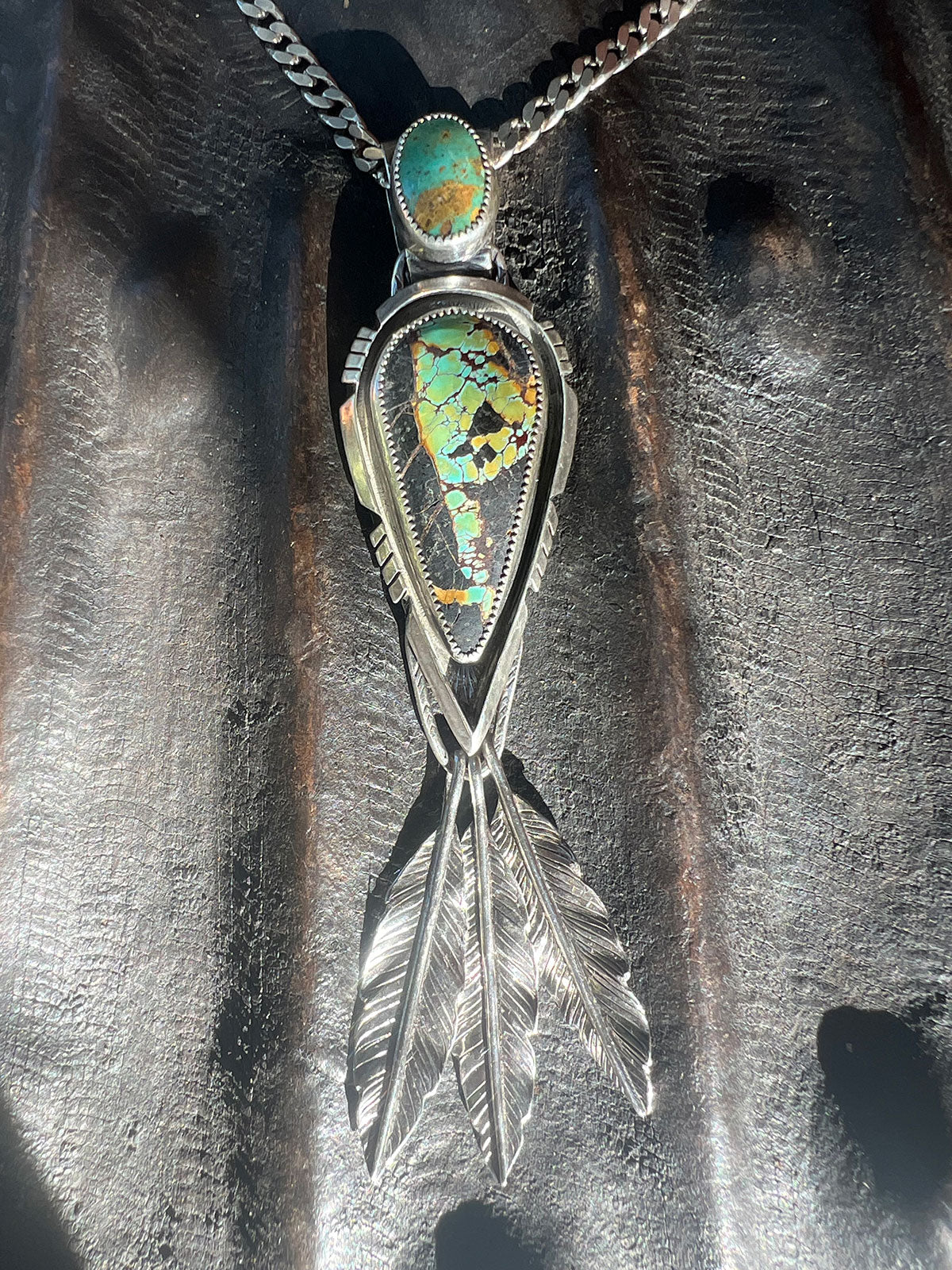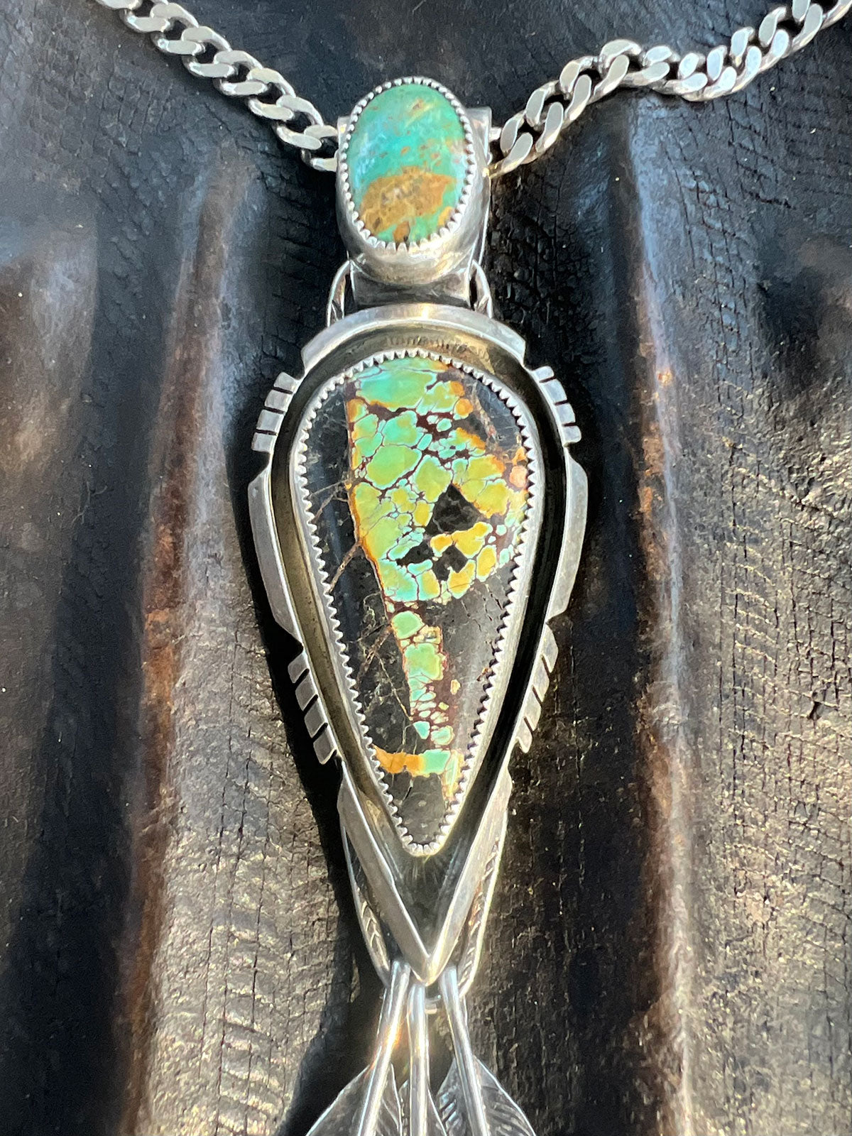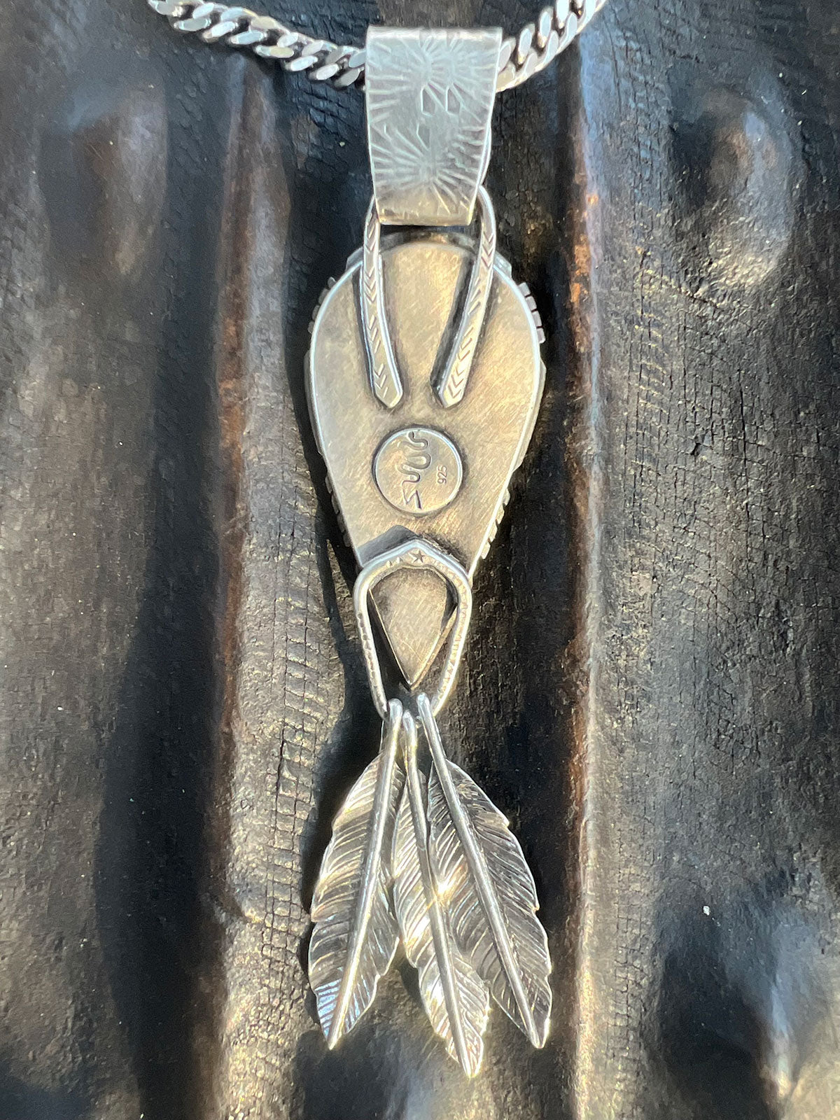 A gorgeous slice of Blackjack Turquoise crowns this sterling silver arrow pendant. Hand-cut shadowbox border, 3 hand-formed double-sided feathers, stamped bale with accent turquoise. A stunning piece meant to be worn, built to last generations. All sterling silver made from scratch by Leeta. Your choice of curb or omega chain (we'll message).
